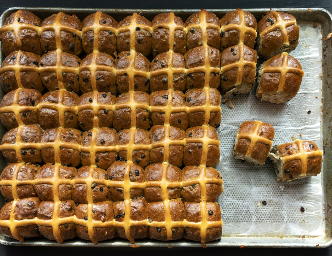Breads Hot Cross Buns Soft, spiced, glazed buns studded with tea-soaked currants and candied orange peel; dough-paste cross.